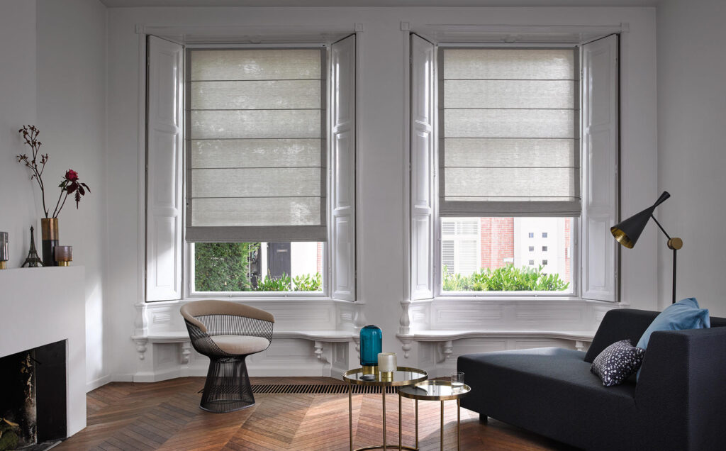 Elegant gefaltete Stofflagen, die Licht und Sonnenschutz flexibel steuern – ideal für Büro, Wohnraum oder Architektur.